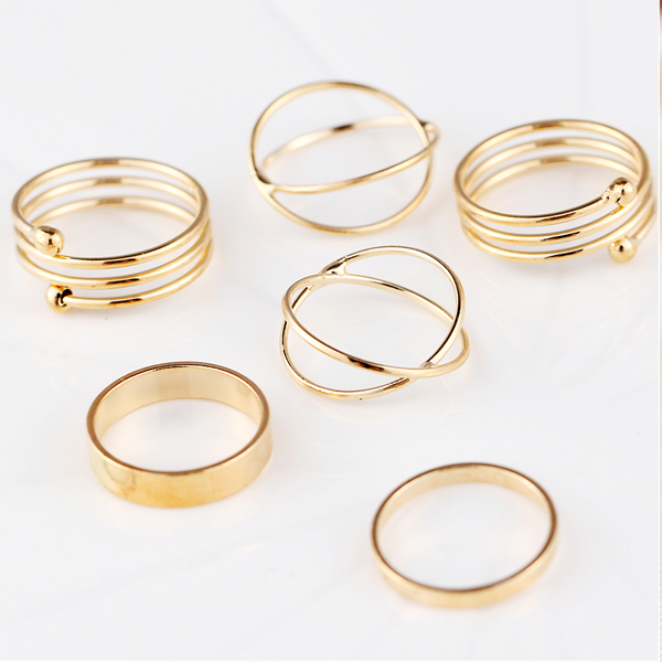 This trendy gold plated stackable ring set will make a bold edgy statement with any of your favorite outfits. Wear them all together or mix and match for a fun new look every day! This 6 piece set is available in a gorgeous gold finish. One size fits all.