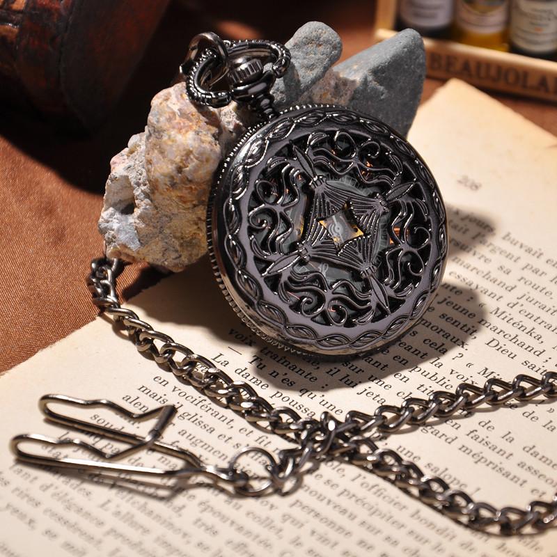 This Black Cage Full Hunter Pocket Watch is a classic design for anyone to appreciate.  The cover is intricately crafted with a complete black caging, giving it added character and mystique.  A truly unique gift for any occasion.  The crystal face cut-out on the back cover brilliantly showcases the skeleton and mechanics of  the clock's inner workings, giving it an antique feel that  any pocket watch lover would enjoy.