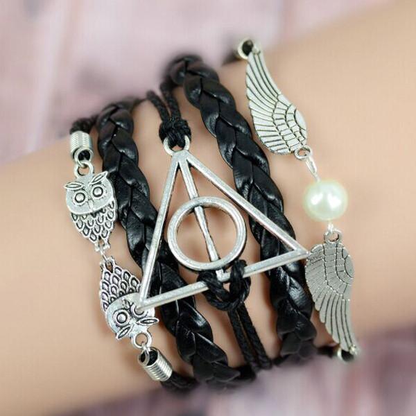 The triangle is often used in jewelry design as one of the most ancient symbols of female divinity. This beautiful bracelet is an elegant depiction of grace and strength. Detailed with three black leather bands. It holds silver finished charms; a pearl within angel wings and a mirrored owl charm to signify both wisdom and protection. A great accessory to wear everyday or to give as a gift to mark any special occasion.