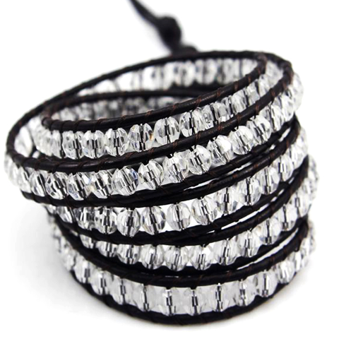 Black on Clear Crystal Wrap Bracelet is made with breathtaking Angel Aura Quartz Healing Crystal beads around wrapped black leather. Angel Aura Quartz's purpose is to cleanse and open the chakras, making it an uplifting and enlightening addition to any space.