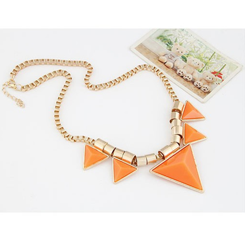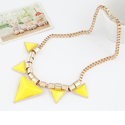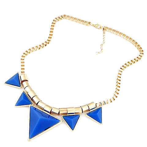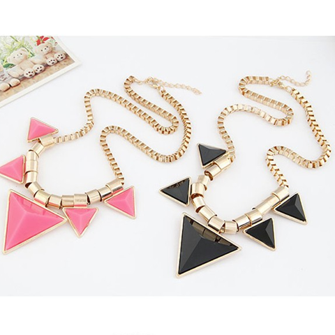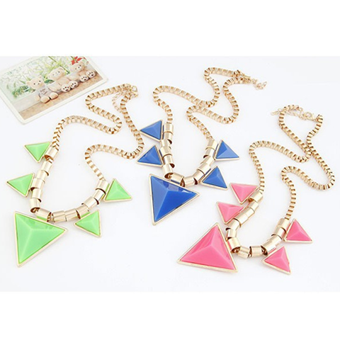 The Bold Triangle Statement Necklace features a striking triangle shape that gives it a certain sense of urban-chic appeal. It comes in a variety of vibrant colors to suit your styling needs, making it a great gift for anyone to admire.