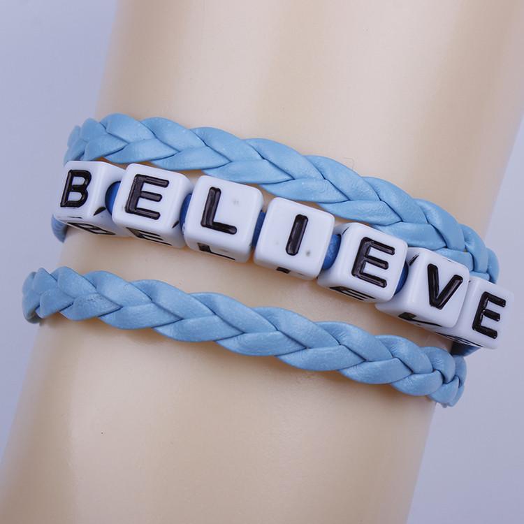 Wear this soft toned blue bracelet as a token of inspiration throughout the entire day. A meaningful and casual accessory to enjoy with any outfit. Made with carefully braided blue leather bands, surrounding a black on white inscription with the word "believe".